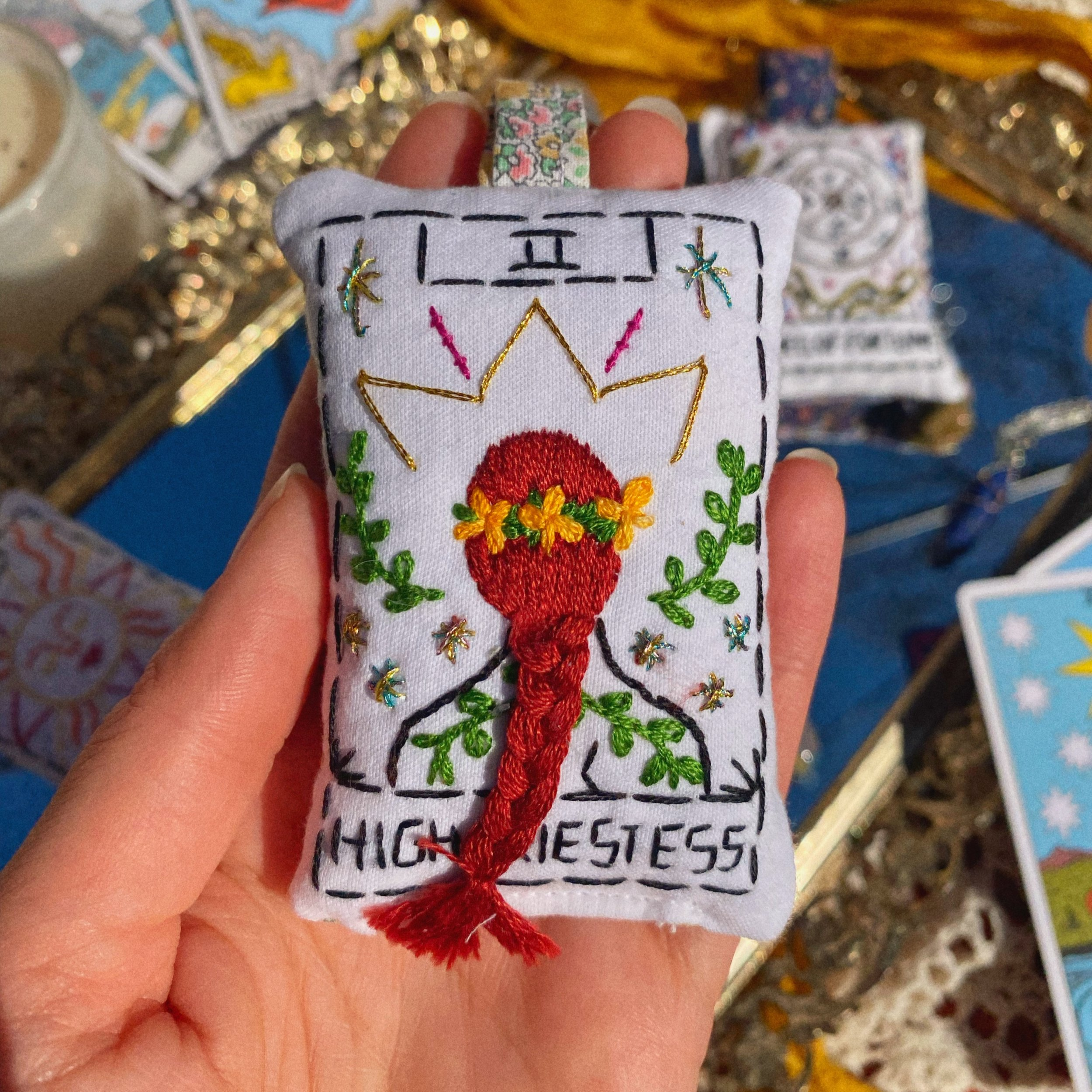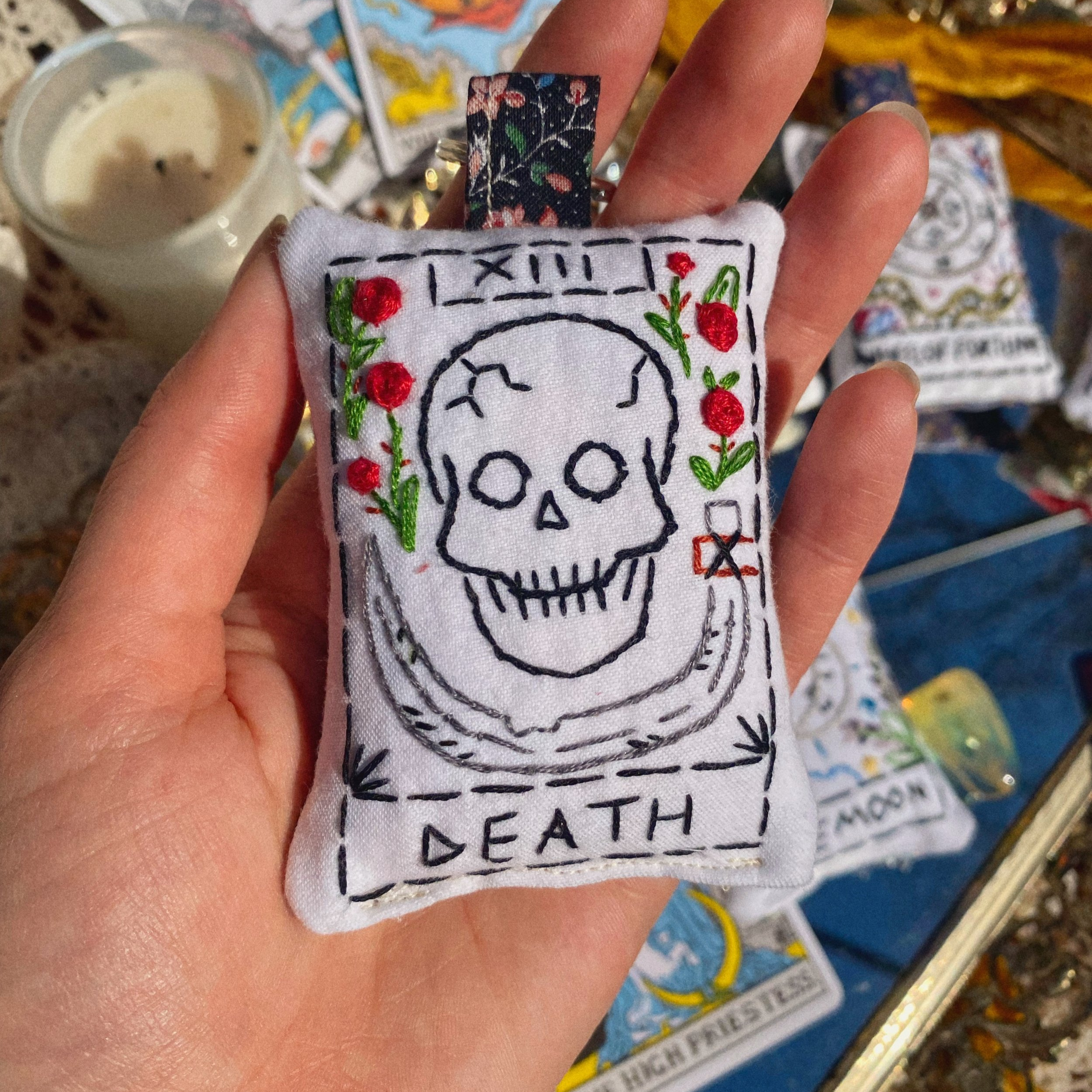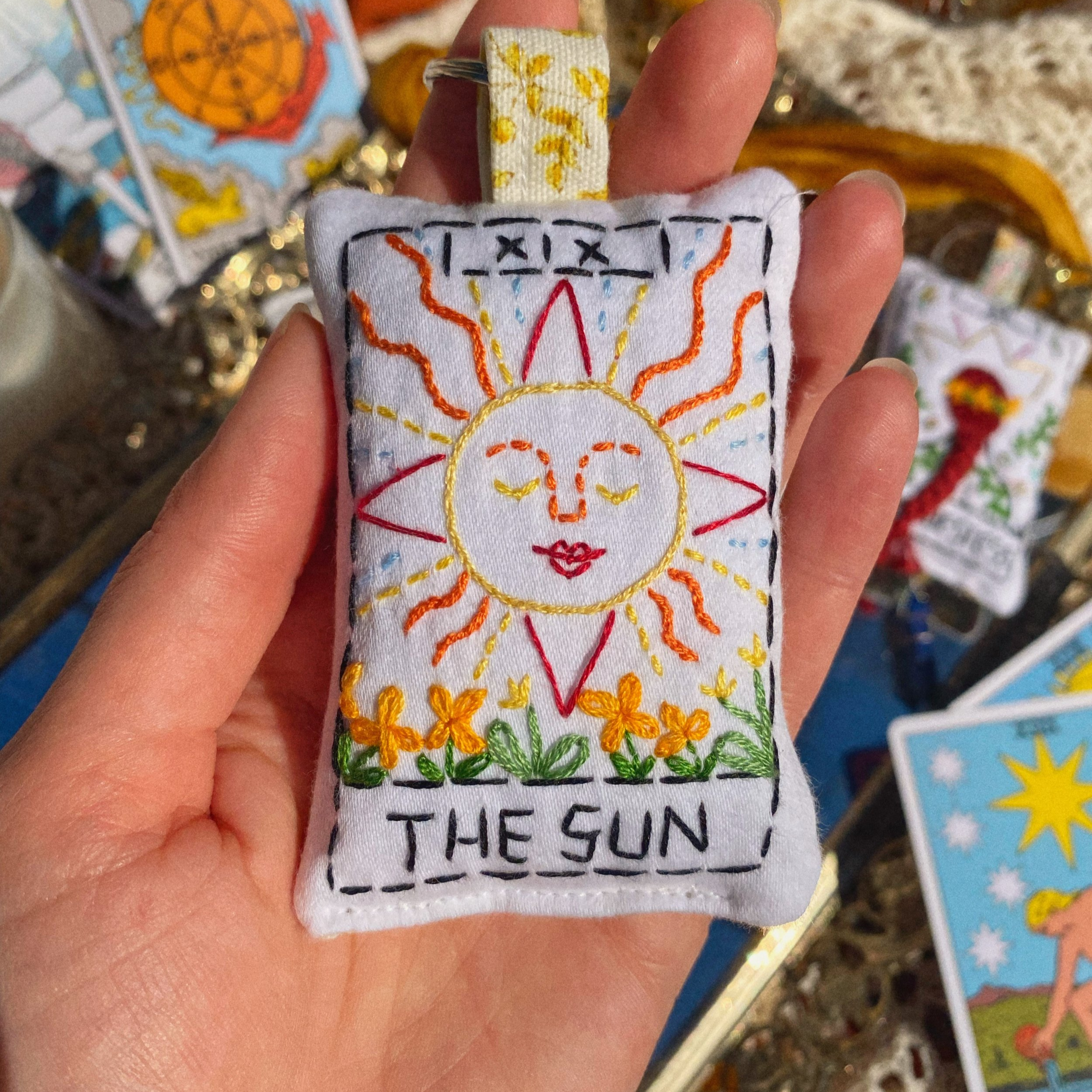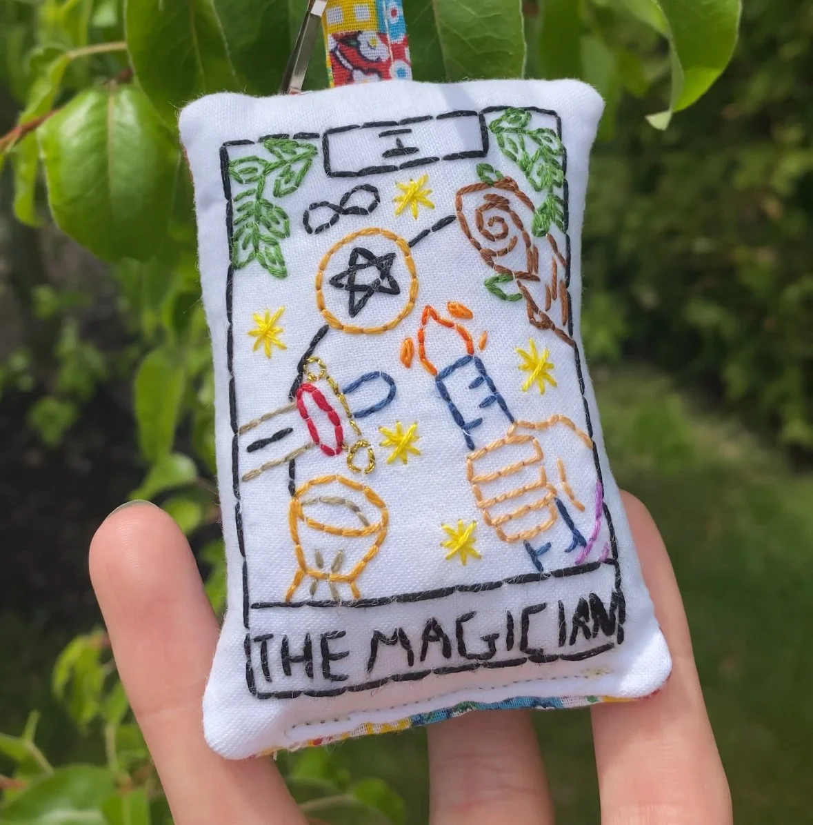 ‘Tarot Talismans’ are designed & embroidered in house, sewn with love & made with 100% recycled materials. Perfect for the sustainable witch or causal Tarot enthusiast. A magical addition to your car keys, belt loops & tote bags!