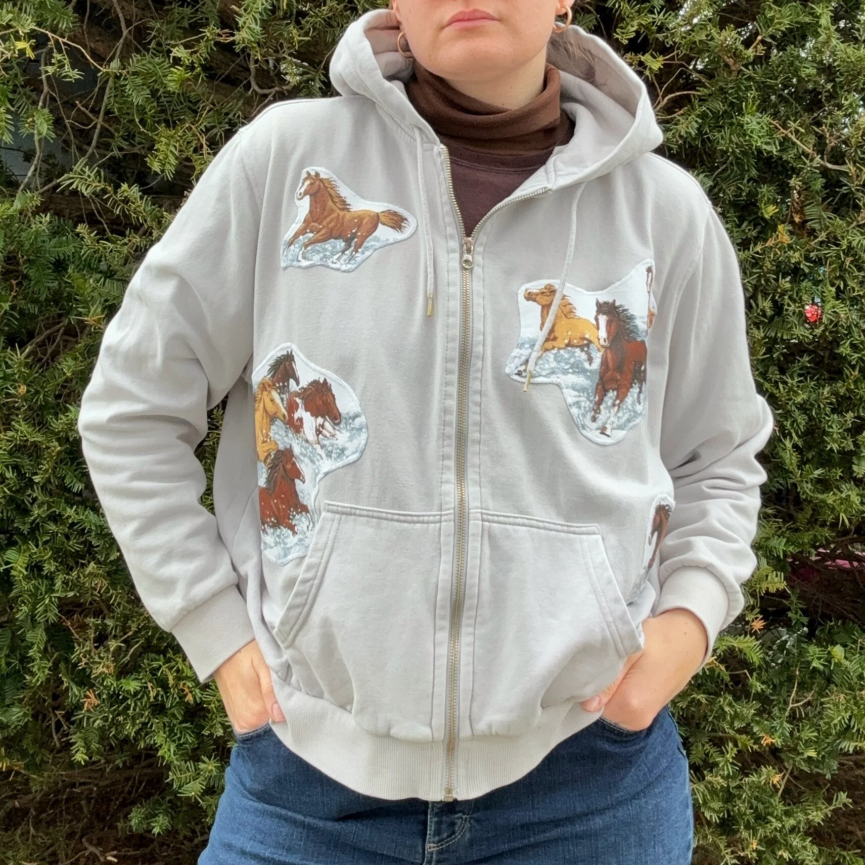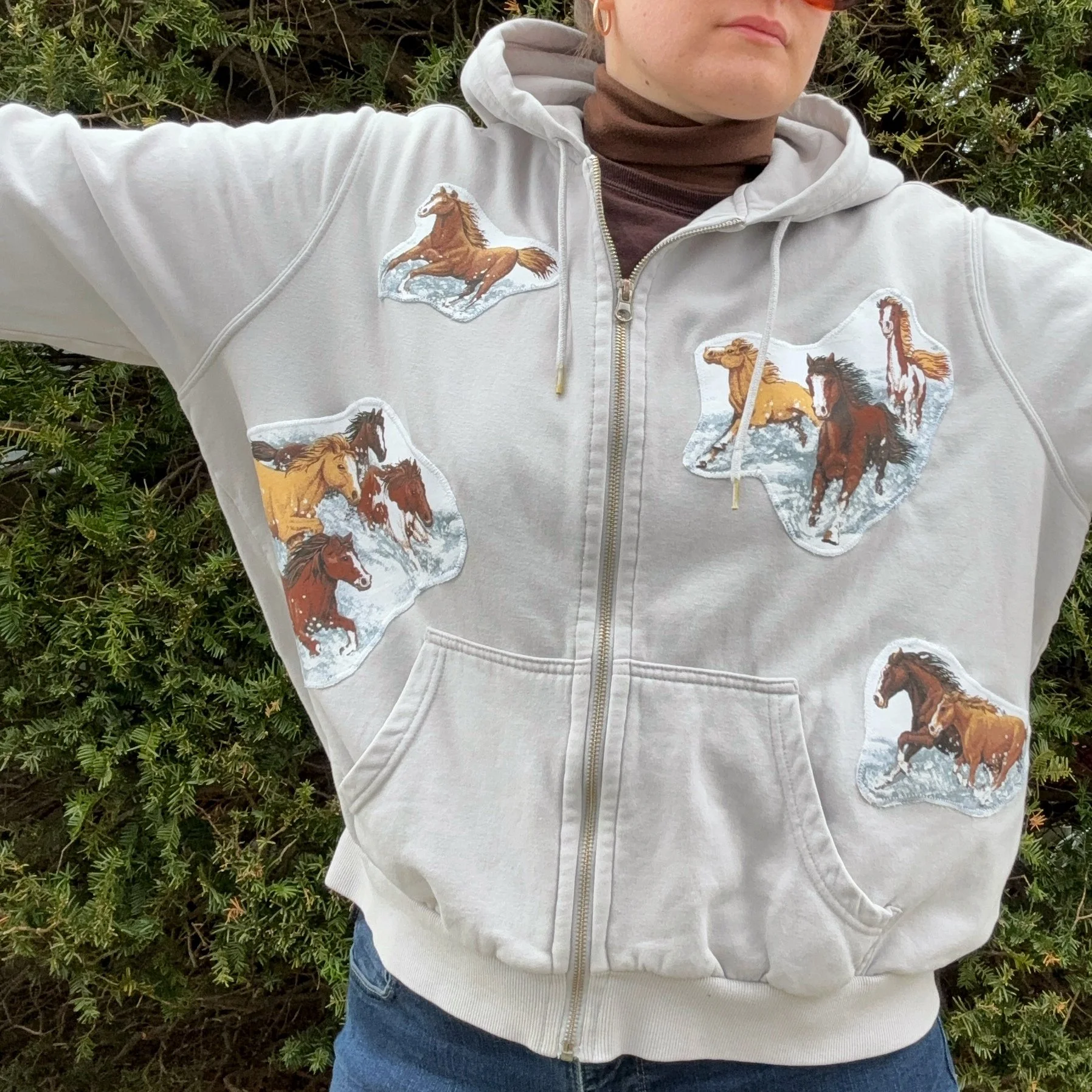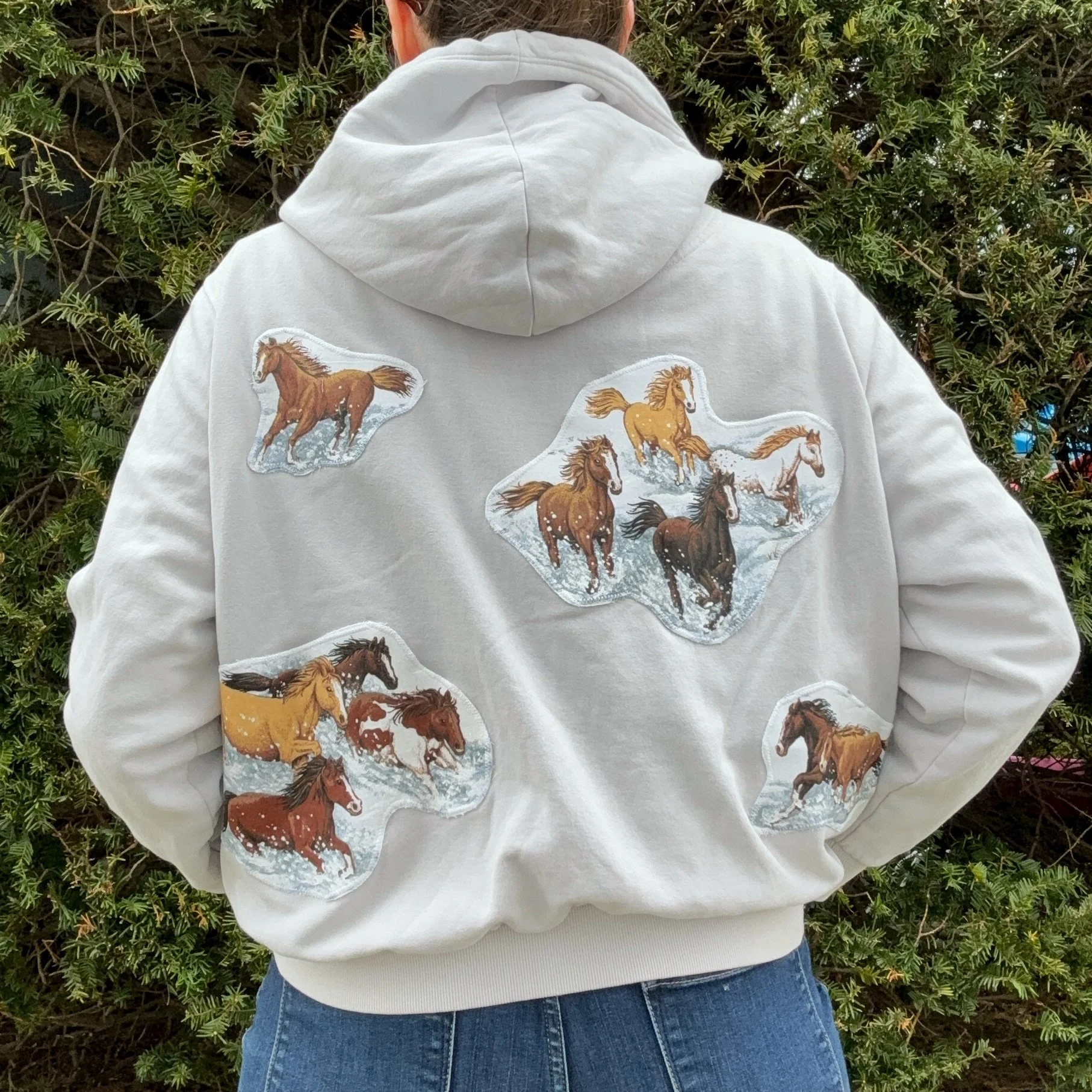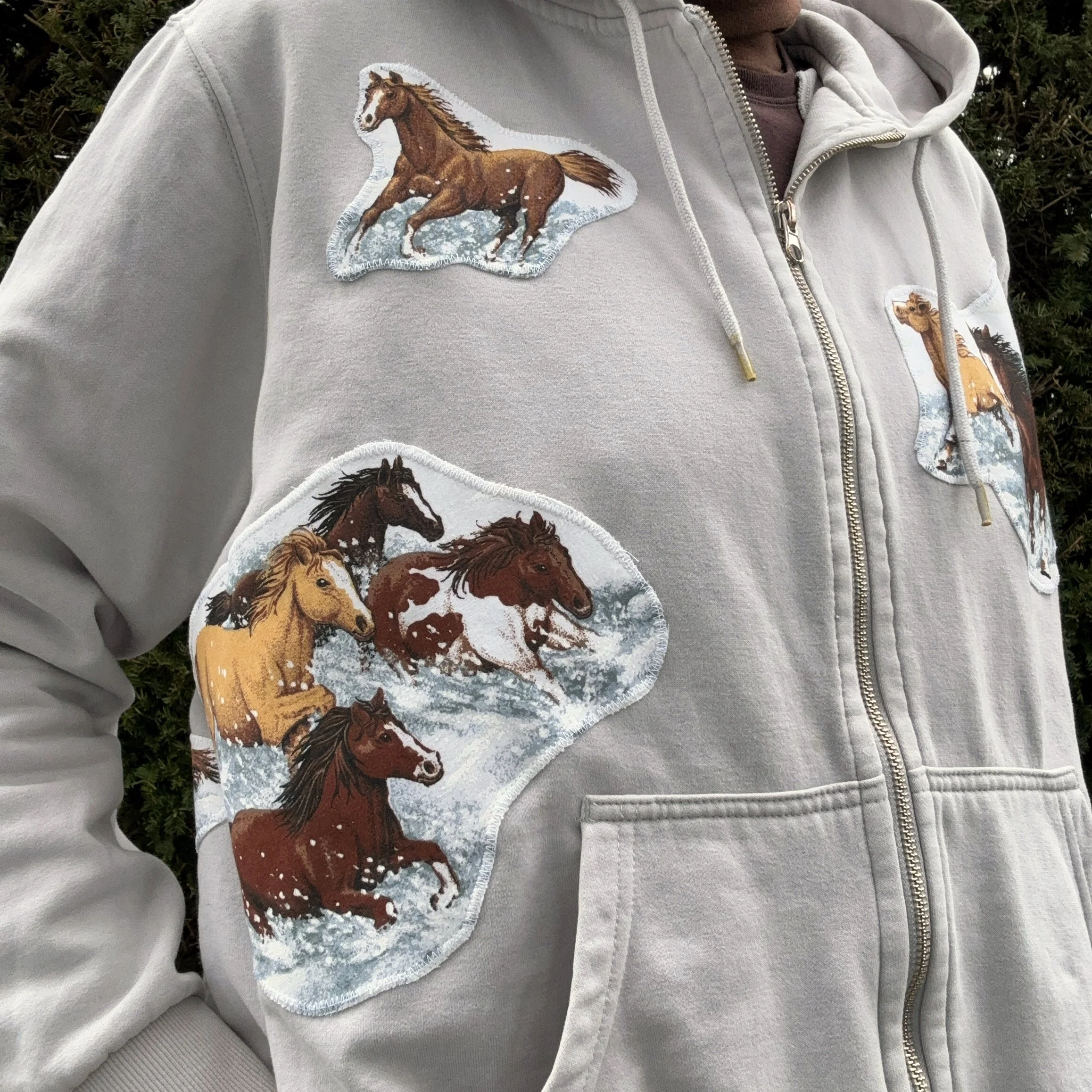 material: secondhand crewneck (57 cotton, 43 polyester), reclaimed textiles, recycled materials